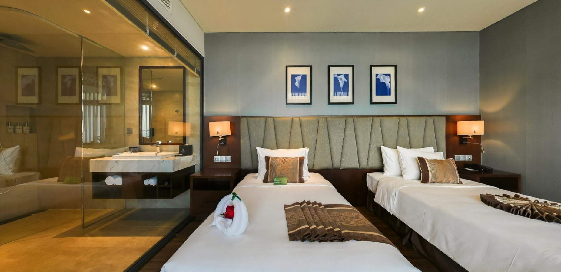 - Phòng rộng 38m², thiết kế hiện đại, tông màu ấm cùng nội thất gỗ óc chó sang trọng